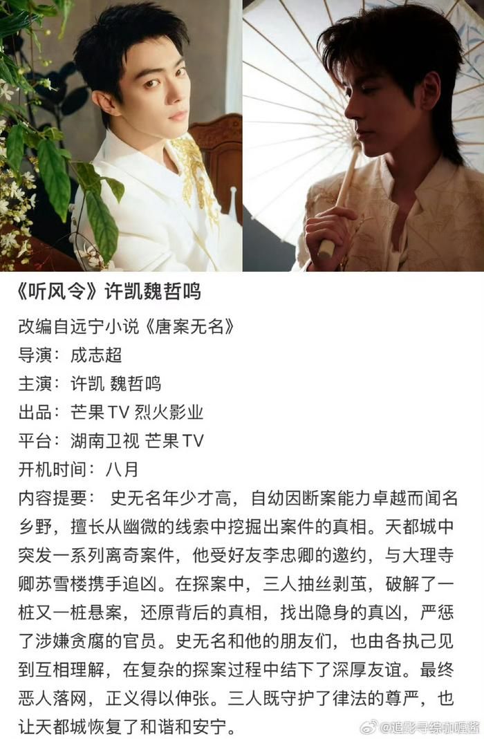 Xu Kai and Wei Zhe Ming Cast in Hunan TV’s Tang Dynasty Investigation C-drama Ting Feng Ling to Start Filming This Month September 2025